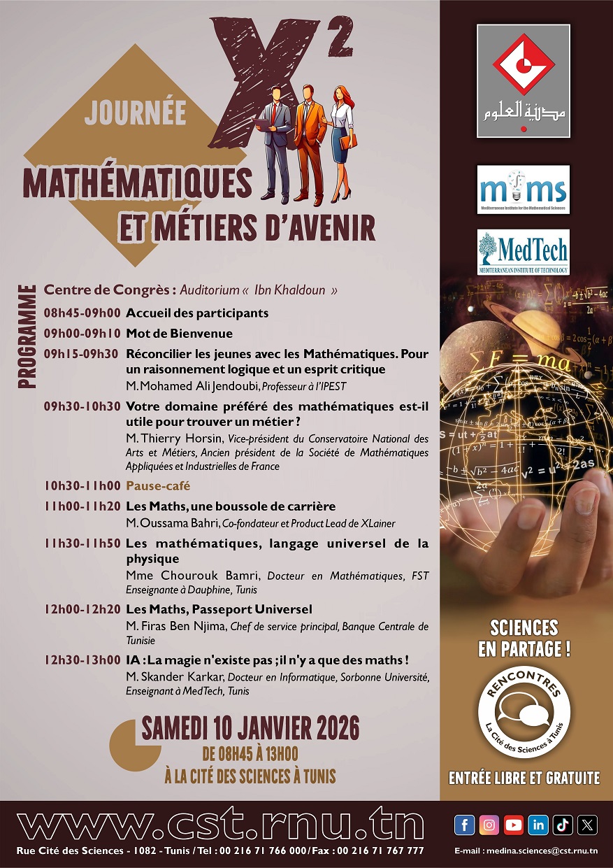 La Cité des Sciences à Tunis, en partenariat avec l’Association Méditerranéenne des Sciences Mathématiques (MIMS) et l’Institut français de Tunisie (IFT), organise, le Samedi 10 janvier 2025, à l’Auditorium Ibn Khaldoun une journée scientifique intitulée « Mathématiques et Métiers d’Avenir ».